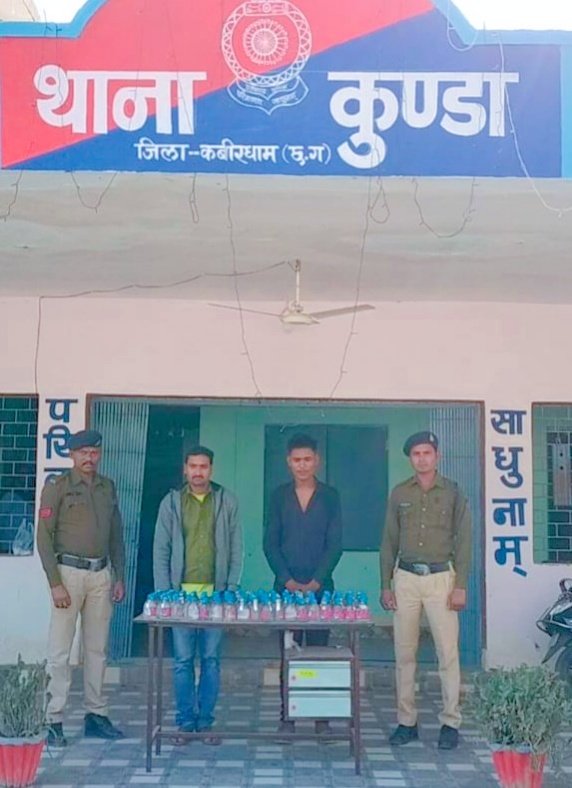 कबीरधाम जिले के पुलिस अधीक्षक डॉ. लाल उमेद सिंह के द्वारा जिले के समस्त थाना एवं चौकी प्रभारियों को अपने-अपने थाना चौकी क्षेत्र में अवैध मादक पदार्थ शराब, गाँजा आदि के अवैध परिवहन एवं बिक्री पर अंकुश लगाने निर्देशित किया गया है। जिस पर अतिरिक्त पुलिस अधीक्षक मनीषा ठाकुर रावटे तथा पुलिस अनुविभागीय अधिकारी पंडरिया पंकज पटेल के कुशल नेतृत्व में थाना कुंण्डा प्रभारी निरीक्षक आनंद शुक्ला के द्वारा थाने में टीम गठित कर जुर्म जरायम पतासाजी हेतु रवाना किया गया था। जिस पर मुखबिर से सूचना प्राप्त हुआ कि दो व्यक्ति बिना नंबर के मोटरसाइकिल हीरो स्प्लेंडर प्लस से अवैध शराब का परिवहन कर रहे हैं, जिसके पास एक काले रंग का कॉलेज बैग व एक सफेद पीले रंग का थैला तथा एक लाल रंग का थैला में अवैध शराब रखा हुआ है जो सेन्हाभाटा की ओर जा रहा है। उक्त सूचना पर तत्काल थाना प्रभारी के द्वारा पुलिस टीम को सेन्हाभाटा रोड में नाकेबंदी कर आने जाने वाले वाहनों को चेक करने हेतु चेकिंग पॉइंट लगाकर वाहनों की चेकिंग की जा रही थी। इसी दौरान 02 व्यक्ति बिना नंबर प्लेट के स्प्लेंडर में आते हुये दिखाई दिये जिसे पुलिस टीम के द्वारा रोक कर नाम पता पूछने पर 01.भरत चंद्राकर,02. गोविंद विश्वकर्मा बताएं, जिनके पास रखें, एक काले रंग का कॉलेज बैग, एक सफेद पीले रंग का थैला, एक लाल रंग के थैले की तलाशी लेने पर कुल 172/ नग देसी प्लेन मदिरा किमती 13760/ रुपये एवं परिवहन में उपयुक्त 01 नग सोल्ड स्प्लेंडर प्लस मोटरसाइकिल कीमती 70000/ रुपये कुल जुमला कीमती 83760/ रुपये को गवाहों के समक्ष जप्त कर आरोपियों के विरुद्ध थाना कुंण्डा में अपराध पंजीबद्ध कर धारा 34,(2) आबकारी एक्ट के तहत कार्यवाही कर गिरफ्तार किया गया तथा दोनों ही आरोपियों को न्यायालय के समक्ष प्रस्तुत कर जुडिशल रिमांड पर भेजा गया है। उक्त कार्यवाही में थाना कुंण्डा पुलिस टीम का सराहनीय योगदान रहा।