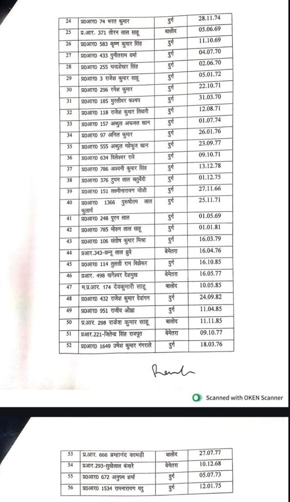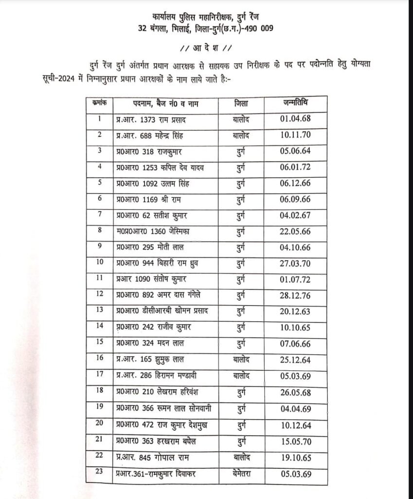 तहलका न्यूज दुर्ग// पुलिस महानिरीक्षक दुर्ग रेंज, रामगोपाल गर्ग ने स्वतंत्रता दिवस के पूर्व दुर्ग रेंज पुलिस के विभिन्न जिलों में पदस्थ प्रधान आरक्षकों की सहायक उप निरीक्षक पद पर पदोन्नति के लिए योग्यता सूची जारी की है। उपरोक्त योग्यता सूची में दुर्ग रेंज के दुर्ग, बालोद, बेमेतरा जिले से कुल 56 प्रधान आरक्षक के नाम शामिल है।