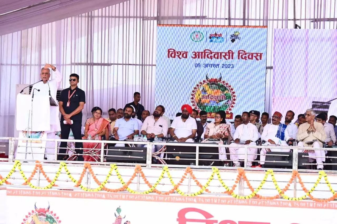 जगदलपुर // विश्व आदिवासी दिवस अमर रहे के नारे के साथ अपना संबोधन प्रारंभ किया मुख्यमंत्री भूपेश बघेल ने सम्भागीय मुख्यालय जगदलपुर में 100 करोड का इंडोर स्टेडियम की घोषणा की. इससे पहले मुख्यमंत्री भूपेश बघेल ने मां दंतेश्वरी को नमन करते हुए विश्व आदिवासी दिवस के अवसर पर अपनी शुभकामनाएं दी। मुख्यमंत्री ने जनजातीय समुदाय के देवी देवताओं को भी नमन किया। हमारी सरकार ने सबसे पहले विश्व आदिवासी दिवस के अवसर पर शासकीय अवकाश देने की शुरुआत की है। आदिवासी परब सम्मान निधि की दूसरी किश्त जारी की गई है। यह पहली बार हुआ है कि आदिवासियों के जो त्यौहार है, परब है उसके लिए सम्मान निधि 10 हजार रुपये सालाना देने का निर्णय लिया, आदिवासी भाई बहन उल्लास के साथ अपने त्यौहार पर्व मना सकें।