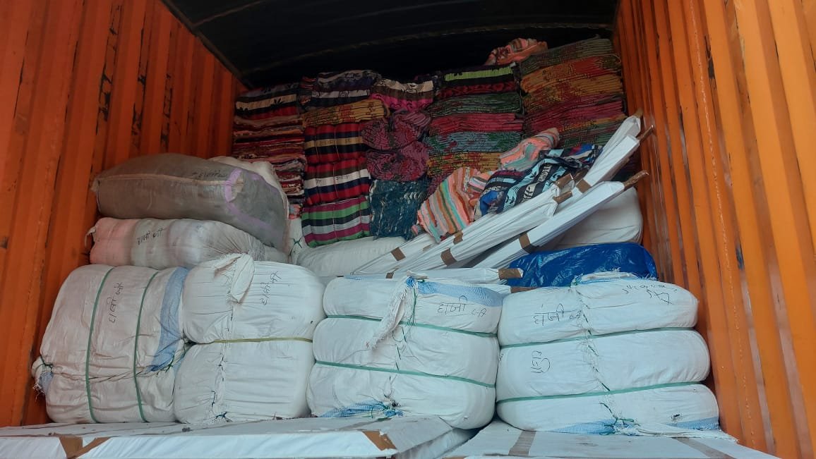 चुनाव हेतु वाहनों की चेकिंग के दौरान भारी मात्रा मे चादर भरी हुई कंटेनर जप्त।