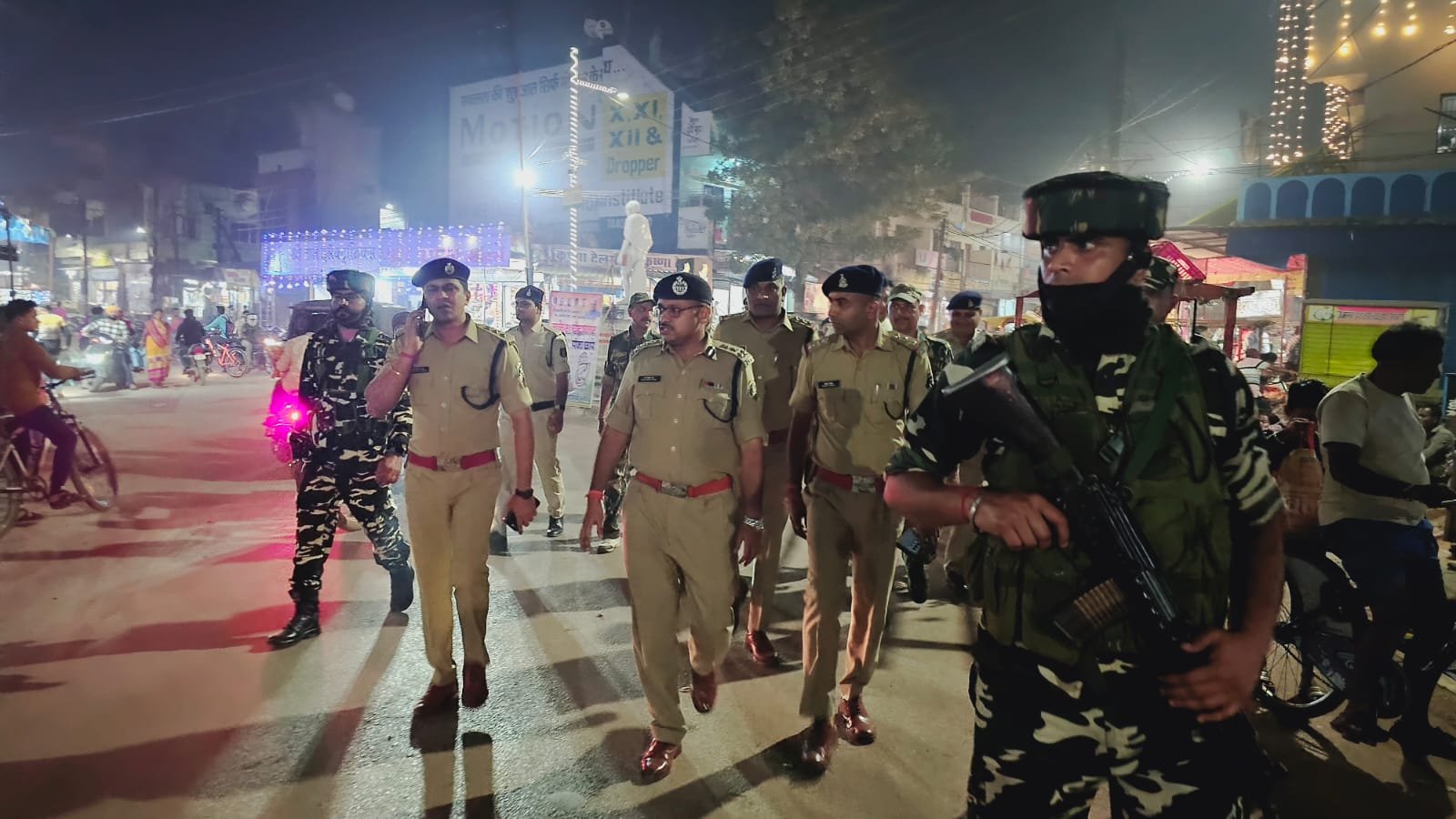 भ्रमण में नगर पुलिस अधीक्षक छावनी आशीष बंछोर एवम थाना प्रभारी खुर्सीपार व छावनी एवम केंद्रीय सुरक्षा बलों के 30 से अधिक जवानों के साथ फ्लैग मार्च निकाला गया।