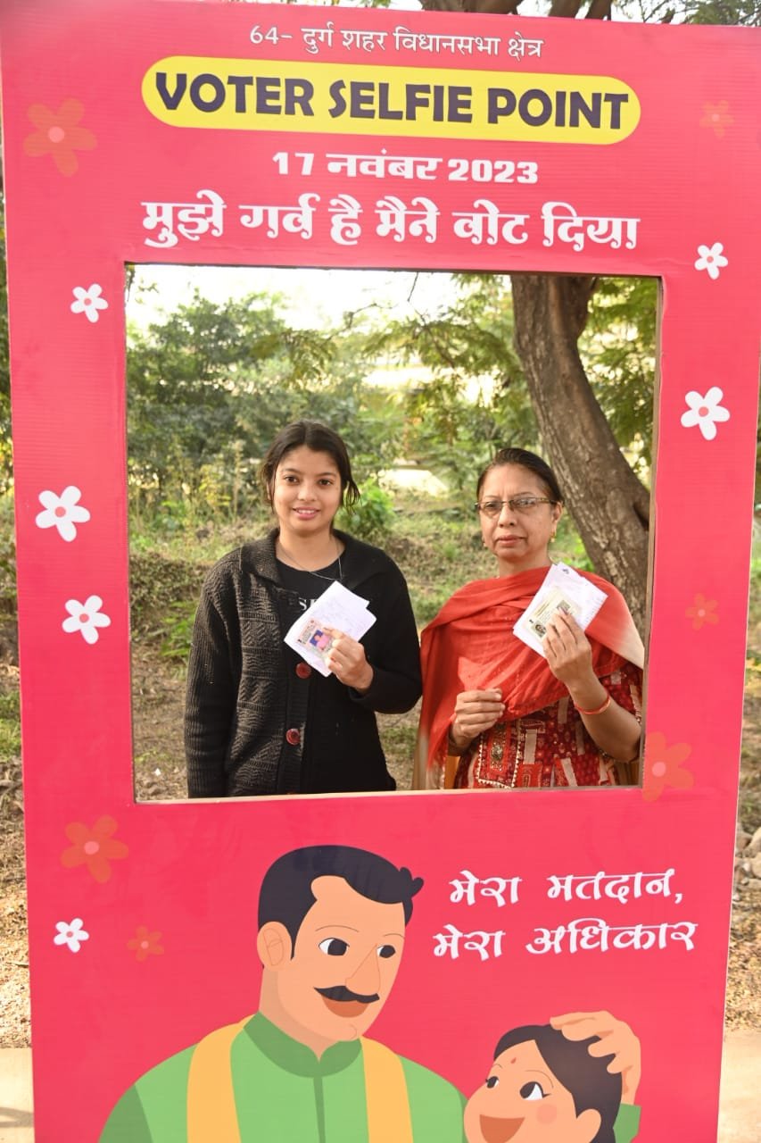 तहलका न्यूज़ दुर्ग// विधानसभा निर्वाचन 2023 के तहत 64-दुर्ग शहर विधानसभा क्षेत्र के मतदान क्रमांक 129 में अपनी माता के साथ पहुँची, फर्स्ट टाइम वोटर कुमारी साधना ने आदर्श मतदान केन्द्र में उपस्थित होकर मतदान किया। कुमारी साधना पहली बार अपनी मताधिकार का प्रयोग करने पर काफी उत्साहित दिखी और अपनी खुशी जाहिर की और अन्य लोगों को प्रेरित करने के लिए सेल्फी पाईंट में जाकर अपनी माता के साथ सेल्फी ली।