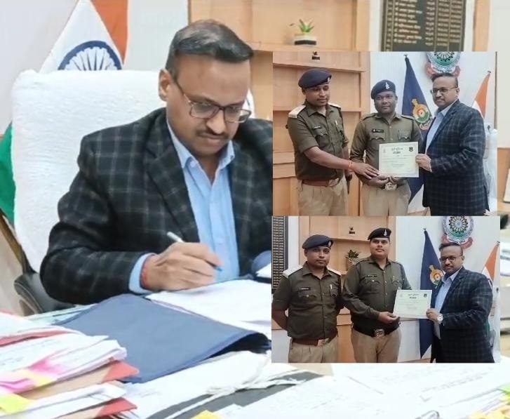 एसएसपी दुर्ग के द्वारा किया गया दो आरक्षकों का सम्मान