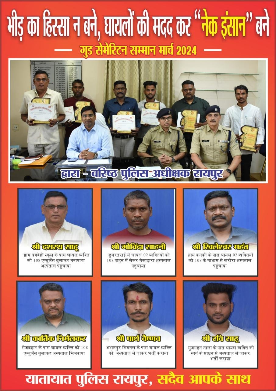 बता दें कि भारत देश में प्रति वर्ष सड़क दुर्घटना में लगभग डेढ़ लाख लोगो की मृत्यु होती है, जिसका प्रमुख कारण घायलों को त्वरित चिकित्सा व्यवस्था उपलब्ध नही होने के कारण होता है। सड़क दुर्घटना के दौरान 30 मिनट का समय गोल्डन आवर कहलाता है इस दौरान यदि घायल व्यक्ति को किसी भी प्रकार से हास्पिटल तक पहुंचा दिया जाता है या फिर चिकित्सा व्यवस्था उपलब्ध करा दिया जाता है तो घायल की जान बचाई जा सकती है। किन्तु अधिकांश सड़क दुर्घटनों में लोगों द्वारा बार बार पेशी जाना पड़ेगा व पुलिस द्वारा बार बार पूछताछ के लिए आना पडे़गा परेशानी होगी सोचकर मोबाइल फोन से विडियों फोटो बना लिया जाता है किन्तु घायल की जान बचाने हेतु कोई उपाय नही किया जाता जिससे घायल व्यक्ति त्वरित उपचार के अभाव में तड़प-तड़प कर दम तोड़ देता है। जिसे दृष्टिगत रखते हुए वरिष्ठ पुलिस अधीक्षक जिला रायुपर संतोष कुमार सिंह द्वारा सभी थाना प्रभारियों को निर्देशित किया है कि थाना क्षेत्र में घटित सड़क दुर्घटना में घायल को त्वरित सहायता पहुंचाने हेतु गुड सेमेरिटंस का अधिक से अधिक प्रचार-प्रसार करने एवं घायल को त्वरित सहायता पहुंचाकर जान बचाने वाले गुड सेमेरिटंस को प्रोत्साहित व पुरस्कृत करने हेतु उपस्थित कराने निर्देशित किया गया है। इसी क्रम में आज दिनांक को रायपुर जिले में घटित विभिन्न सड़क दुर्घटनाओं में घायलों की मदद करने वाले गुड सेमेरिटंस को वरिष्ठ पुलिस अधीक्षक जिला रायपुर श्री संतोष कुमार सिंह द्वारा मोंमेंटो व प्रशस्ति पत्र देकर सम्मानित किया गया साथ ही इनका फोटो बड़े-बड़े होर्डिंग में लगाने निर्देशित किया गया।