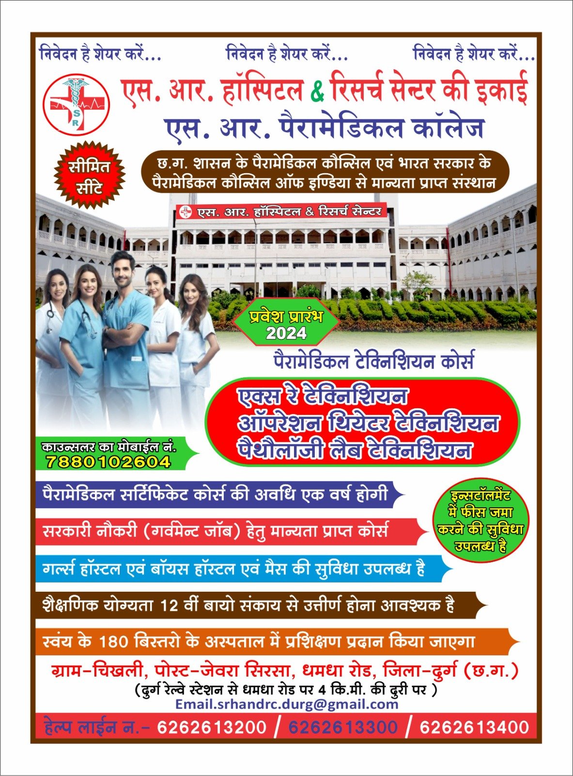 एस.आर.हॉस्पिटल दुर्ग में पैरामेडीकल टेक्नीशियन कोर्स में एडमीशन की अन्तिम तिथी 30 मार्च 2024