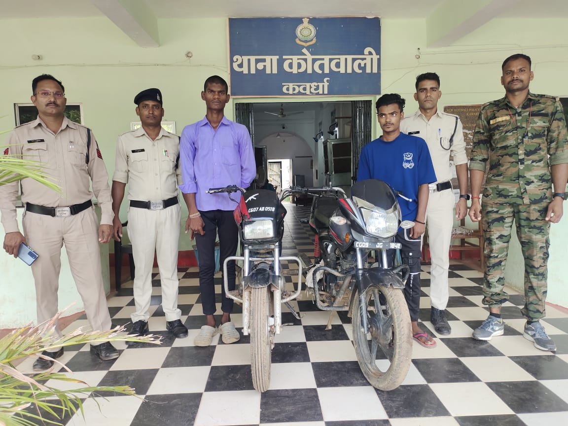 (3) एक विधि से संघर्षरत बालक प्रार्थीगणों ने दिनांक 25.04.2024 एवं दिनांक 13.06.2024 को अपने-अपने मोटर सायकल होण्डा साईन क्रमांक सीजी 09 JG 1842 एवं मोटर सायकल स्पलेन्डर प्रो क्रमांक सीजी 07 AB 0518 को नवीन बाजार कवर्धा में खड़ा किया था जिसे कोई अज्ञात व्यक्ति चोरी कर ले गया था। जिसकी रिपोर्ट पर अज्ञात आरोपी के विरूद्व थाना कवर्धा में अपराध क्रमांक 437/2024 धारा 379 भादवि एवं अपराध क्रमांक 438/2024 धारा 379 भादवि पंजीबद्व कर अज्ञात चोरो की जांच पतासाजी की जा रही थी। पुलिस अधीक्षक डॉ. अभिषेक पल्लव, अतिरिक्त पुलिस अधीक्षक विकास कुमार(भा.पु.से.), अति.पुलिस अधीक्षक पुष्पेन्द्र बघेल, उप पुलिस अधीक्षक (अजाक/क्राईम) प्रतीक चतुर्वेदी के द्वारा आरोपी पतासाजी एवं चोरी की वारदात रोकने हेतु पूर्व में आवश्यक दिशा-निर्देश दिया गया था। निर्देशो का पालन करते हुए थाना एवं सायबर सेल की विशेष टीम गठित किया गया, टीम द्वारा आस-पास पतासाजी किया गया पतासाजी दौरान तकनीकी साक्ष्य के आधार पर पता चला कि आरोपीगण (1) राजा सारथी पिता संतोष सारथी उम्र 19 साल साकिन लोहारानाका भाजपा कार्यालय के पीछे कवर्धा थाना कवर्धा (2) संजय धुर्वे पिता धूरसिंह धुर्वे उम्र 21 साल साकिन जुनवानी थाना कवर्धा एवं अपचारी बालक द्वारा नवीन बाजार कवर्धा से दोनों मोटर सायकल चोरी करना पाया गया,जिन्हे विधिवत पूछताछ करने पर जुर्म स्वीकार करने पर चोरी गये मोटर सायकल बरामद किया गया है। प्रकरण में आरोपीगण एवं विधि विरूद्व संघर्षरत बालक के विरूद्व विधिवत कार्यवाही कर माननीय न्यायालय के समक्ष प्रस्तुत किया गया है। भविष्य में पूरे जिले में किसी भी प्रकार की चोरी या अन्य वारदात में शामिल होने पर कवर्धा पुलिस द्वारा गंभीरता से जांच कर आरोपियों के विरूद्व कड़ी से कड़ी वैधानिक कार्यवाही की जावेगी।