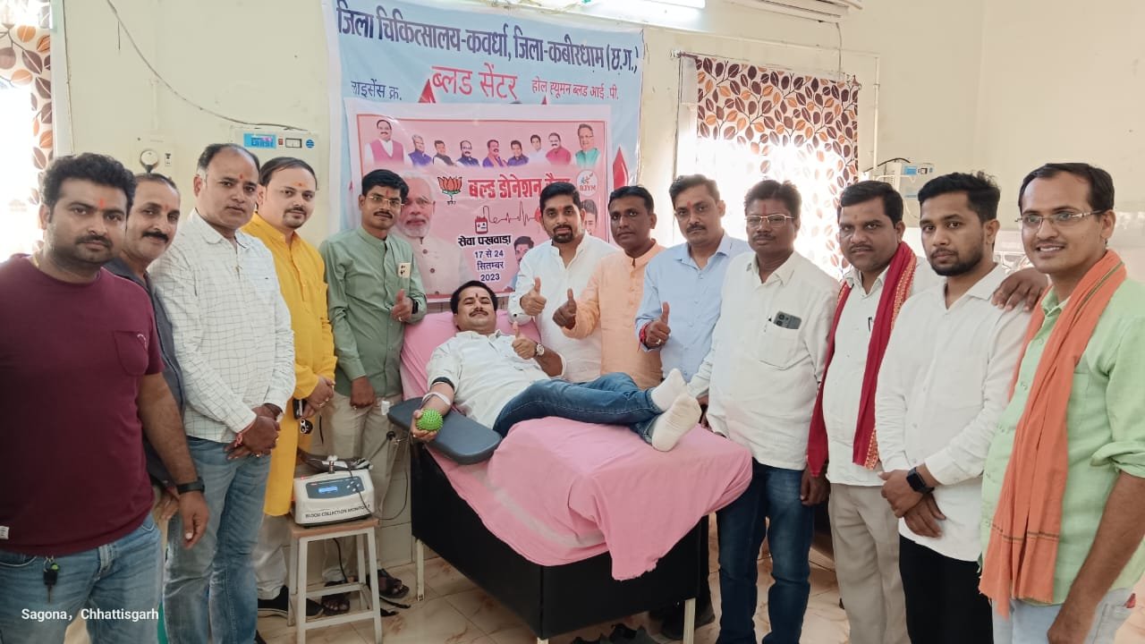 कवर्धा।। देश के प्रधानमंत्री नरेंद्र मोदी के जन्मदिवस के अवसर पर भारतीय जनता पार्टी द्वारा सेवा पखवाड़ा के रूप में मनाया जाना है, जिसमें 17 सितंबर से लेकर 2 अक्टूबर गांधी जयंती तक विभिन्न सेवा प्रकल्प चलाए जाएंगे, इसके तहत भारतीय जनता युवा मोर्चा ने जिला अस्पताल में रक्त दान शिविर लगाया जिसमे जिलाध्यक्ष किसान मोर्चा भुनेश्वर चन्द्राकर सहित युवाओं ने बढ़ चढ़कर रक्तदान किया, किसान मोर्चा जिला अध्यक्ष भुनेश्वर चंद्राकर ने बताया कि हर साल जन्मदिन के अवसर को सेवा पखवाडा दिवस के रूप में मनाया जाता है, जिसमें रक्त दान, किसानो का सम्मान, स्वक्छता के क्षेत्र में कार्य व अनेक कार्य सामाजिक क्षेत्र से जुड़े सभी विषयों पर विस्तार से जानकारी दी, उन्होंने बताया कि पिछले वर्ष भी युवा मोर्चा ने देश भर में रक्तदान शिविरों के माध्यम से रक्त संग्रहण का रिकार्ड बनाया था, इस वर्ष ऐसे शिविर जिले के विभिन्न स्थानों में सप्ताह भर तक लगाए जायेंगे, इस वर्ष युवा मोर्चा को रक्तदान के प्रति जागरूकता अभियान चलाया जा रहा है, रक्तदान शिविर में क्रांति गुप्ता, वीरेंद्र साहू, संतोष पटेल, कैलाश चंद्रवंशी, मनी राम साहू, पीयूष टाटिया, पर्यटन वर्मा, रिंकेश वैष्णव, संजय मिश्रा, उमंग पांडे, आदित्य जांगड़े सहित युवाओं ने रक्तदान किया, इस शिविर में चंद्रप्रकाश चंद्रवंशी, सुनील दोषी, योगेश चंद्रवंशी, तुकेश चंद्रवंशी, अजय ठाकुर, अनिल साहू, दीपक ठाकुर, योगेश ठाकुर, सहित युवा मोर्चा के कार्यकर्ता उपस्थित रहे…