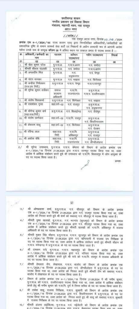 रायपुर : राज्य शासन ने प्रशासनिक दृष्टिकोण से विभिन्न अधिकारियों और कर्मचारियों की अस्थायी रूप से आगामी आदेश तक नियुक्ति और स्थानांतरण किया है।