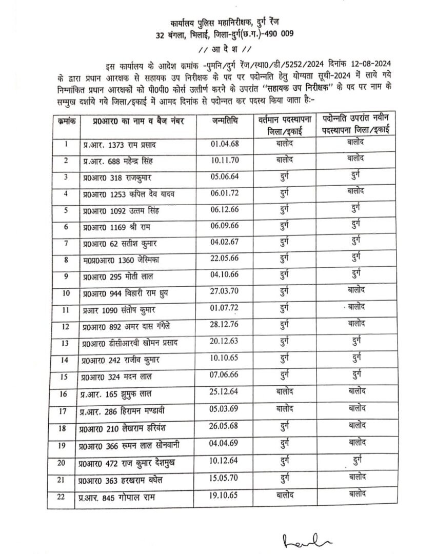 पुलिस महानिरीक्षक, दुर्ग रेंज, राम गोपाल गर्ग ने इन प्रमोशनों को स्वीकृति प्रदान करते हुए आदेश जारी किए। इस प्रमोशन प्रक्रिया के तहत दुर्ग जिले में 11, बालोद में 23 और बेमेतरा के 12 रिक्त पदों पर पुलिसकर्मियों की पोस्टिंग की गई है। जो कि पी. पी कोर्स करने के उपरांत सहायक उप निरीक्षक के पद से पदोन्नति कर पदस्थ किया जाएंगे।