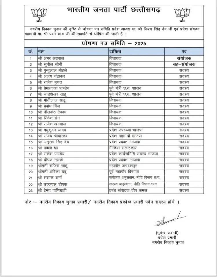 CG: नगरीय निकाय चुनाव: BJP ने जारी की घोषणा पत्र समिति की लिस्ट, अमर अग्रवाल संयोजक, सुनील सोनी सह संयोजक, देखिए सूचि