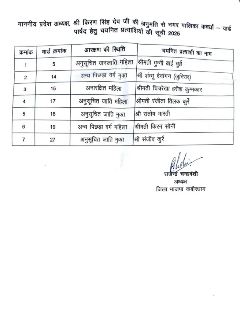 CG: BJP ने कवर्धा नगर पालिका के पार्षद पदों के प्रत्याशियों की सूची जारी की