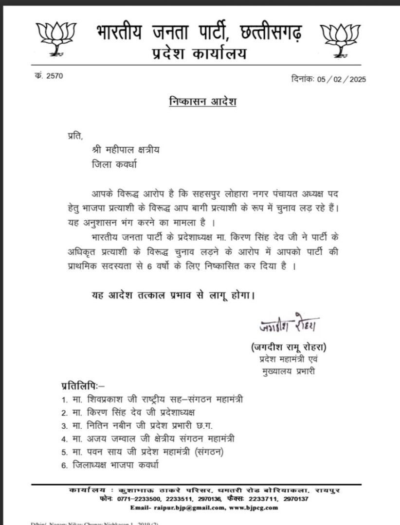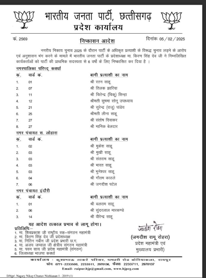 भारतीय जनता पार्टी (BJP) से बगावत कर पार्षद पद के लिए 18 प्रत्याशी और अध्यक्ष पद के लिए 1 प्रत्याशी चुनावी मैदान में थे। निष्कासित प्रत्याशियों में नगर पालिका कवर्धा, नगर पंचायत सहसपुर लोहारा और इंदौरी से चुनाव लड़ रहे बागी प्रत्याशी शामिल हैं। पार्टी ने स्पष्ट किया है कि अनुशासनहीनता को बर्दाश्त नहीं किया जाएगा और जो भी पार्टी विरोधी गतिविधियों में शामिल होंगे, उनके खिलाफ सख्त कार्रवाई जारी रहेगी