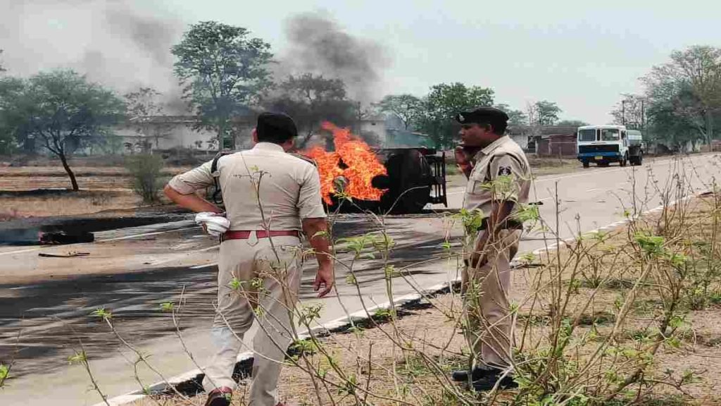 नेशनल हाईवे पर पलटा डीजल टैंकर, गाड़ी में आग लगने से ड्राइवर और हेल्पर घायल