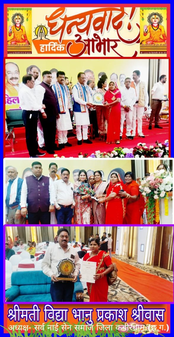 दिनांक 17 जून 2025 को रायपुर स्थित बेबीलॉन होटल में सर्व नाई सेन समाज (महिला विंग) एवं केश शिल्प कला बोर्ड द्वारा आयोजित राज्य स्तरीय महिला जिला अध्यक्ष एवं प्रतिभावान सम्मान समारोह का आयोजन भव्य रूप से किया गया। इस अवसर पर कबीरधाम जिले की महिला प्रकोष्ठ अध्यक्ष विद्या भानु प्रकाश श्रीवास को विशेष रूप से सम्मानित किया गया।